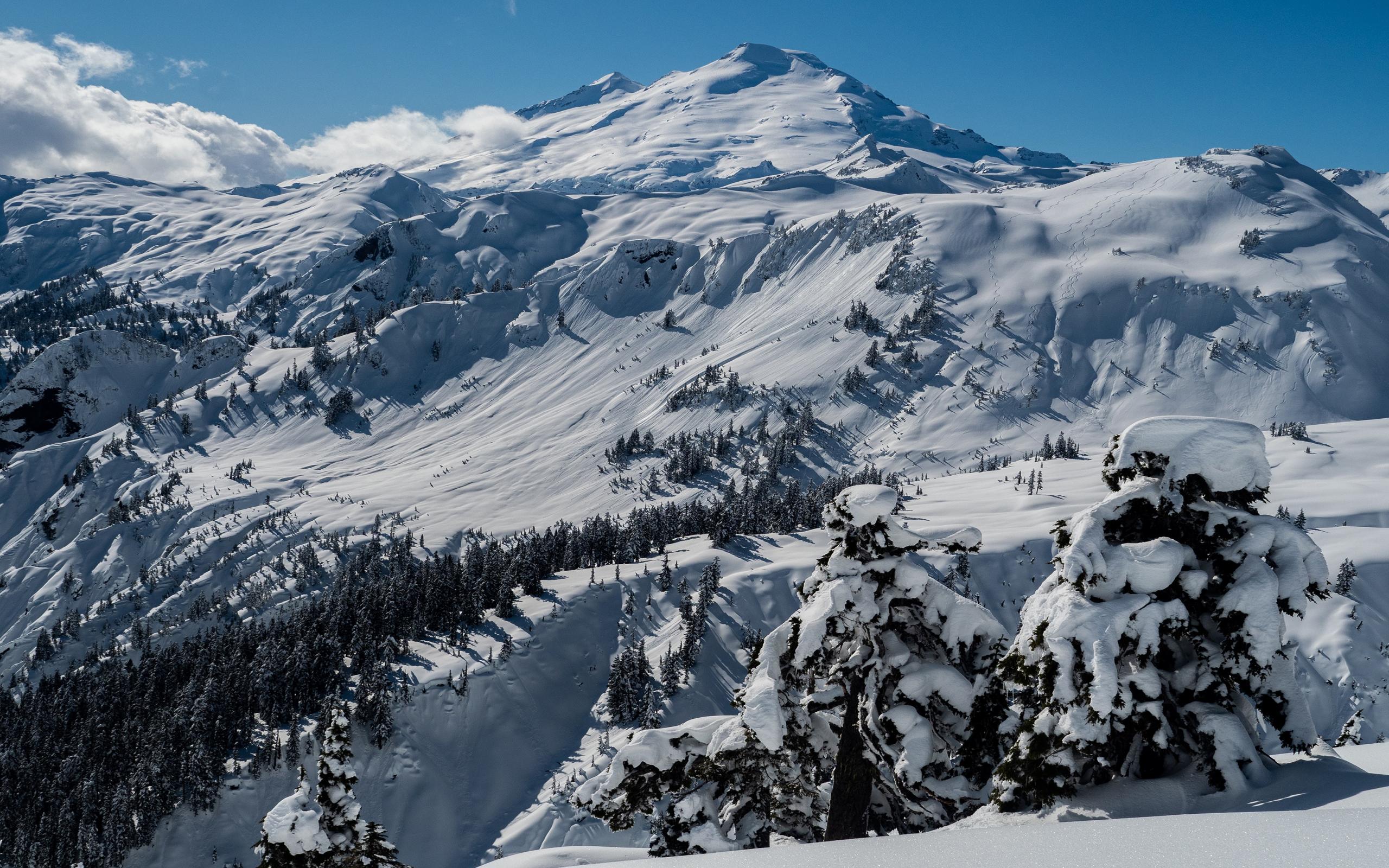 Wallpaper Snow-capped mountain slopes in the rays of the sun under the blue sky