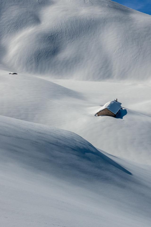 Wallpaper House on the snowy slopes of the mountain in the sun