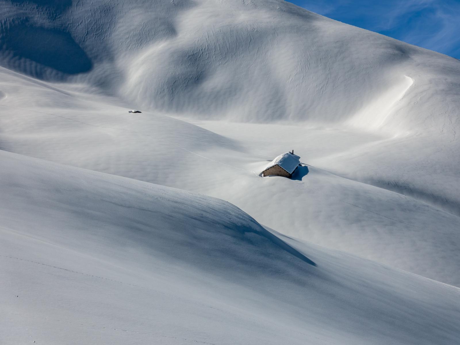 Wallpaper House on the snowy slopes of the mountain in the sun