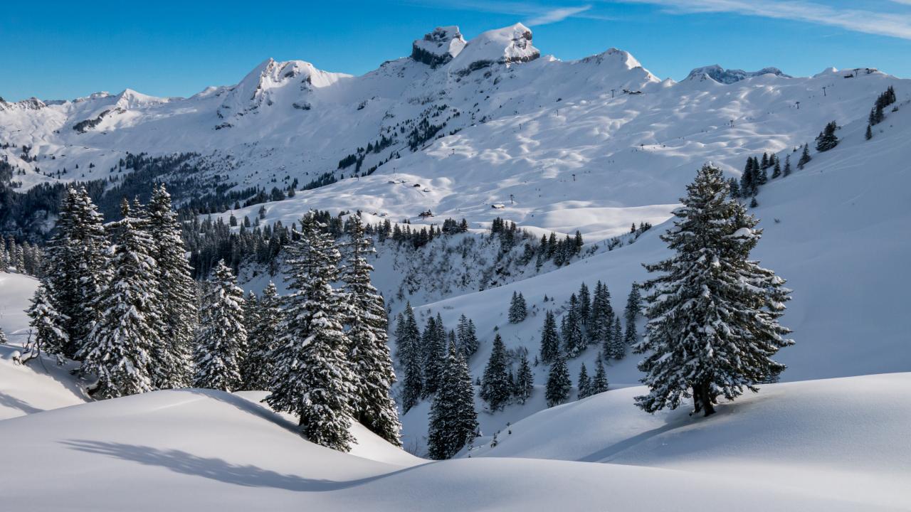 Wallpaper Snow capped mountains with fir trees under the blue sky