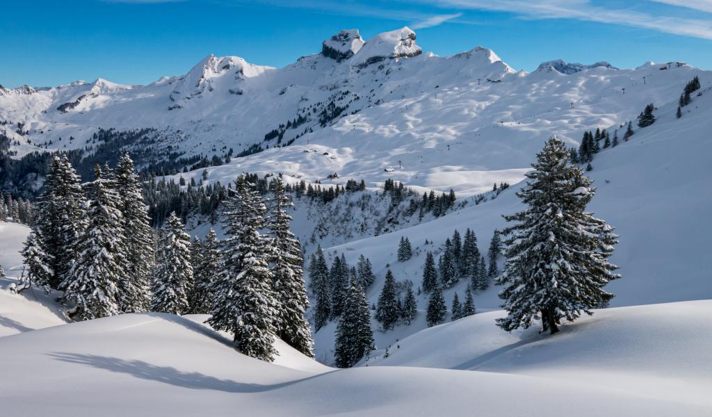 Wallpaper Snow capped mountains with fir trees under the blue sky
