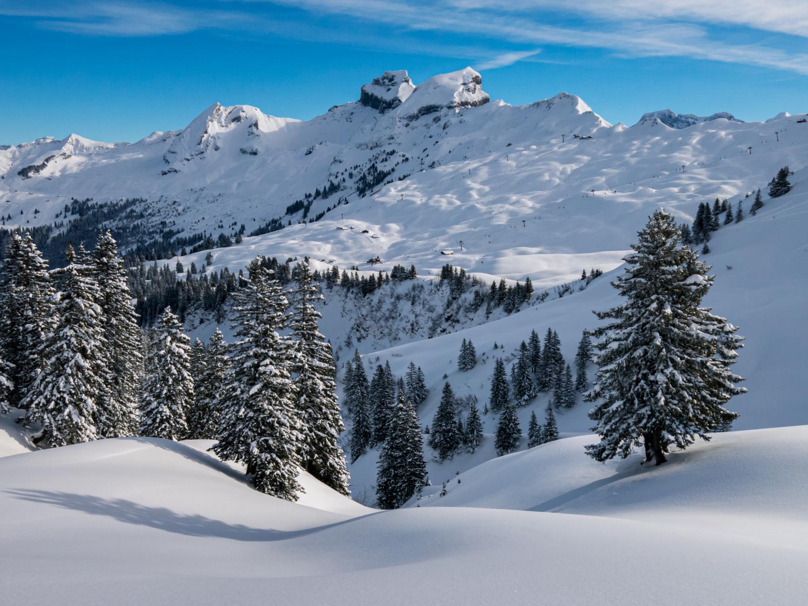 Wallpaper Snow capped mountains with fir trees under the blue sky