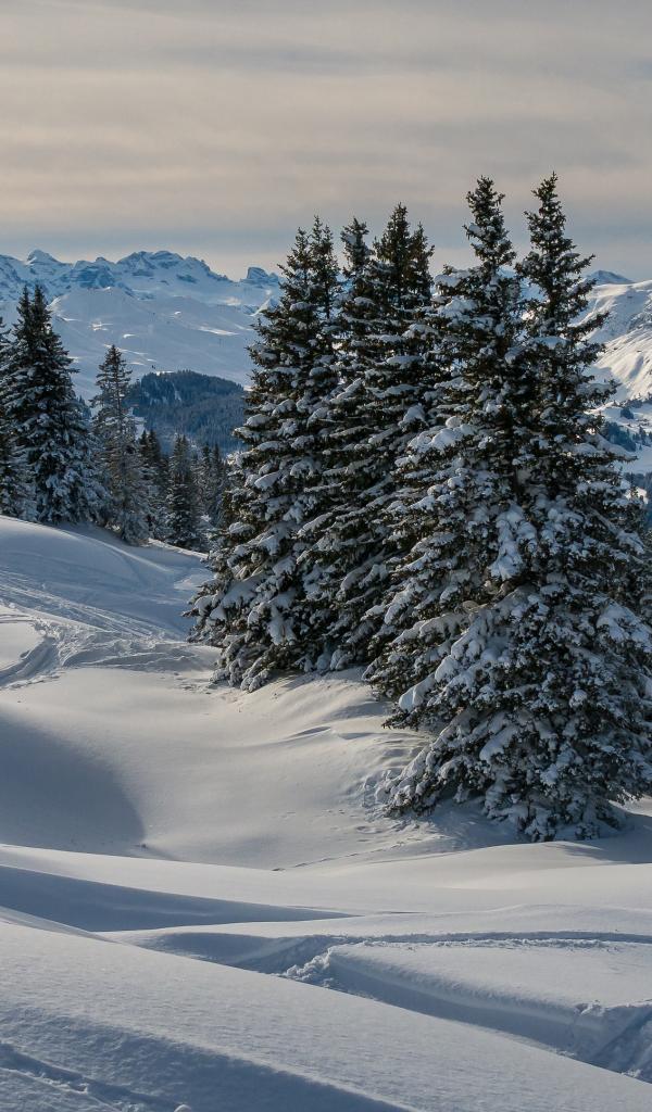 Wallpaper Tall spruce trees on a snowy mountainside in winter