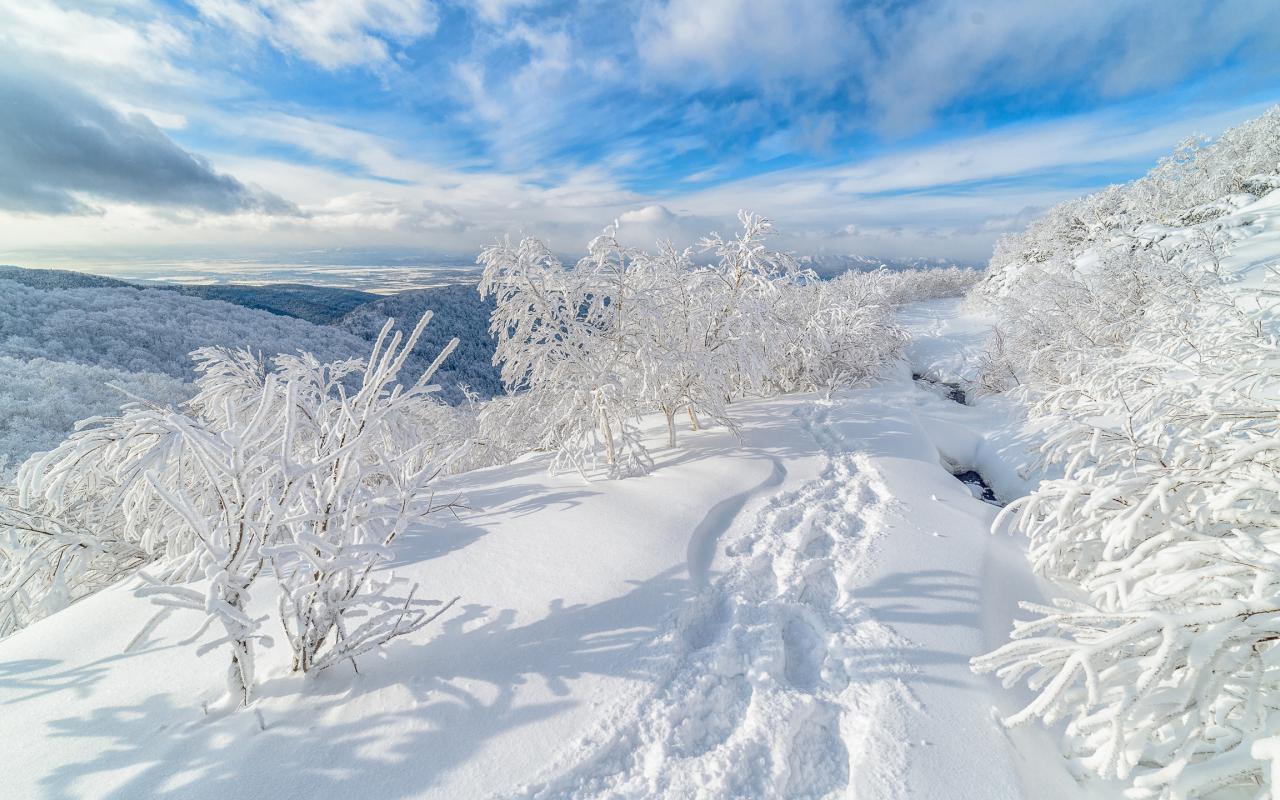 Wallpaper Footprints in white snow near frosty trees
