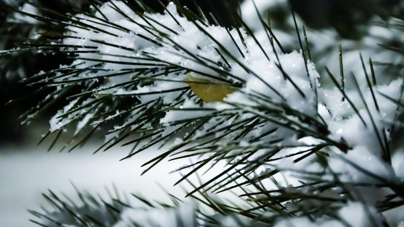 Wallpaper Snow covered pine branch with green needles close up