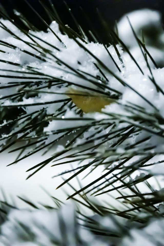 Wallpaper Snow covered pine branch with green needles close up