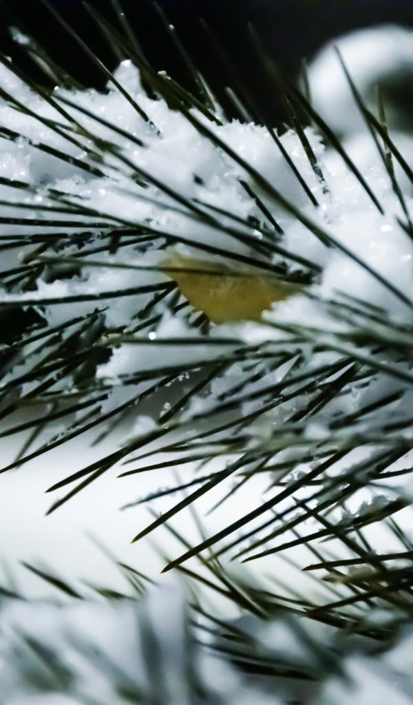 Wallpaper Snow covered pine branch with green needles close up