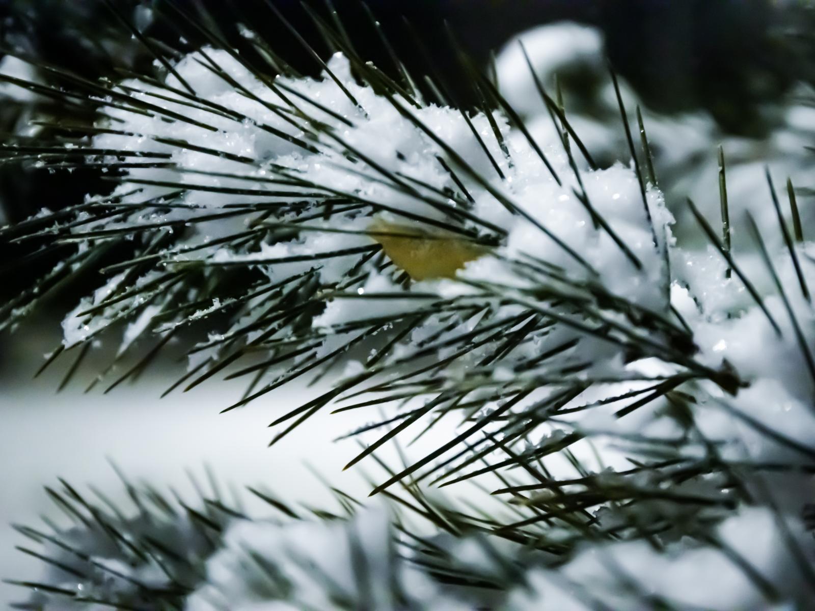 Wallpaper Snow covered pine branch with green needles close up