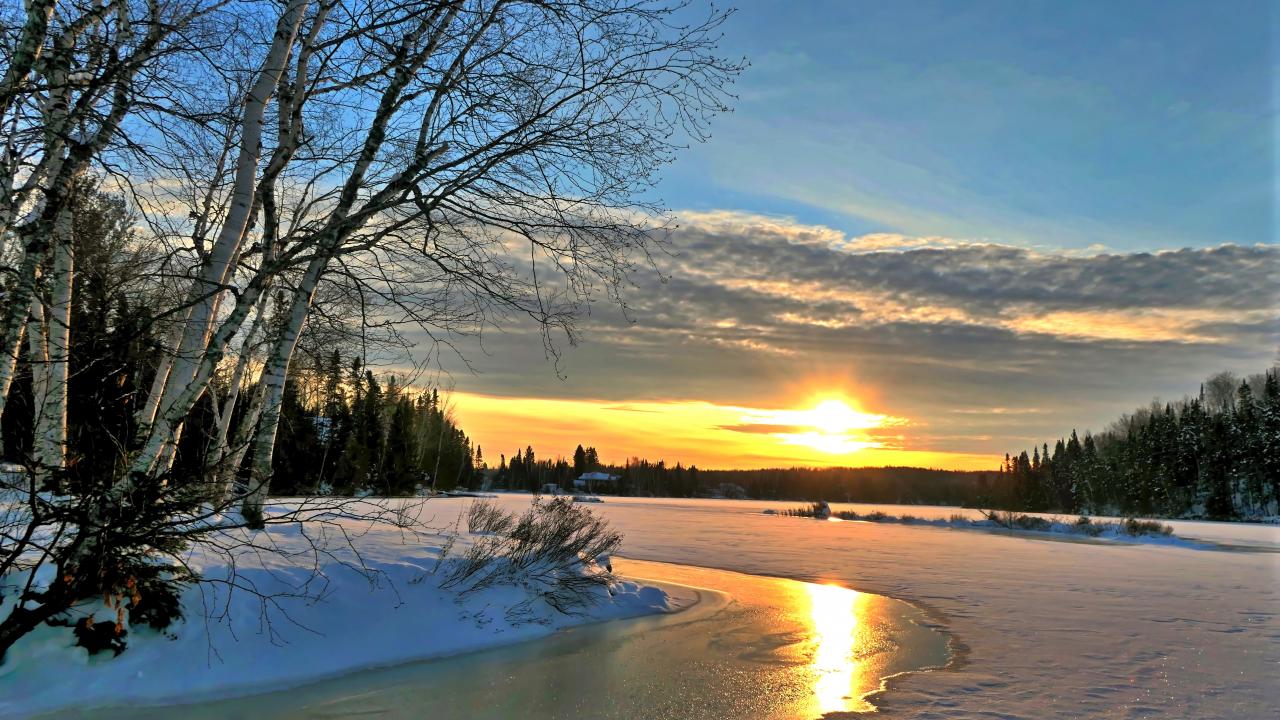 Wallpaper Birches on the banks of an ice-covered river at sunset in winter