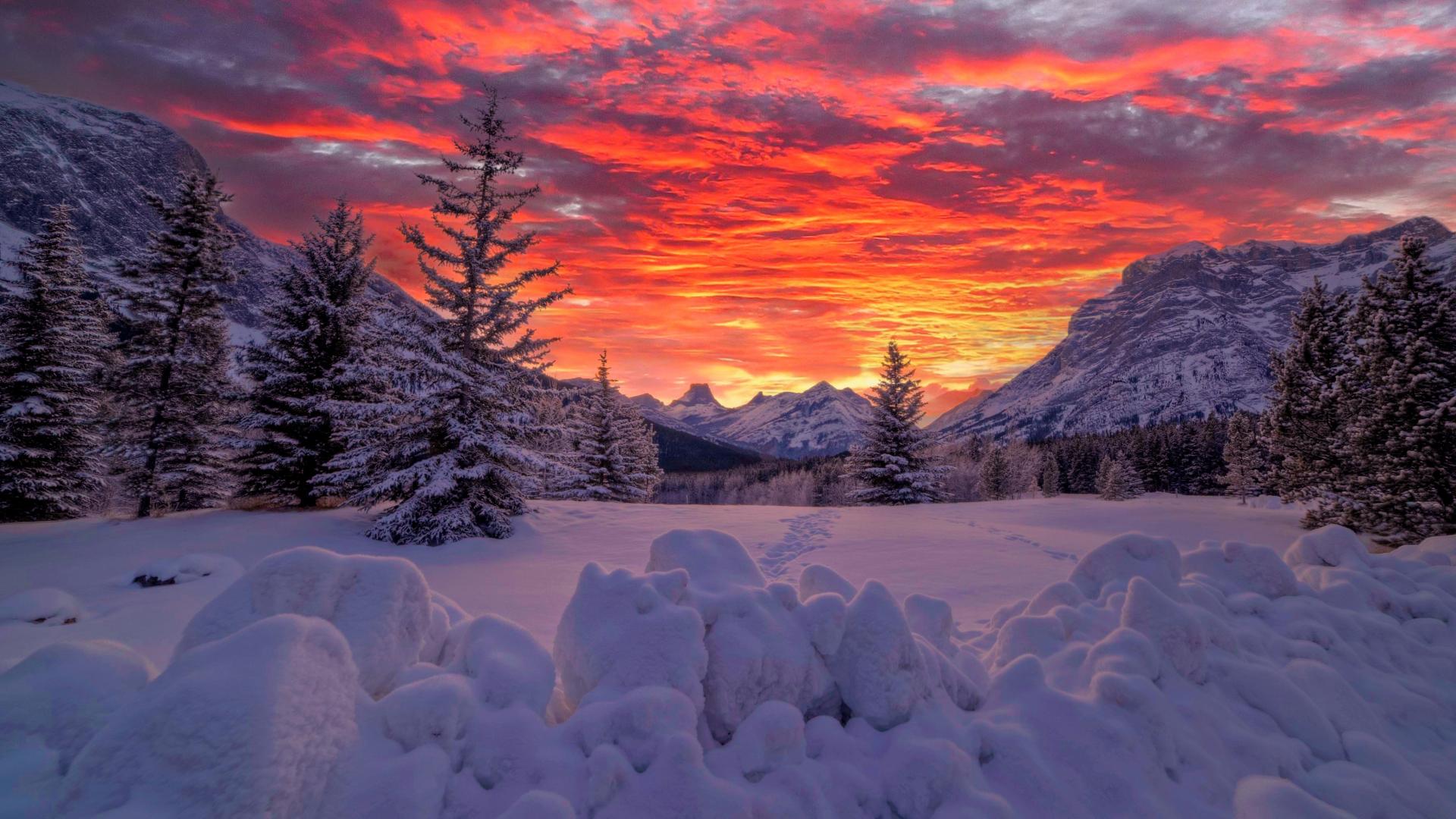 Wallpaper Beautiful orange sunset over snowy forest