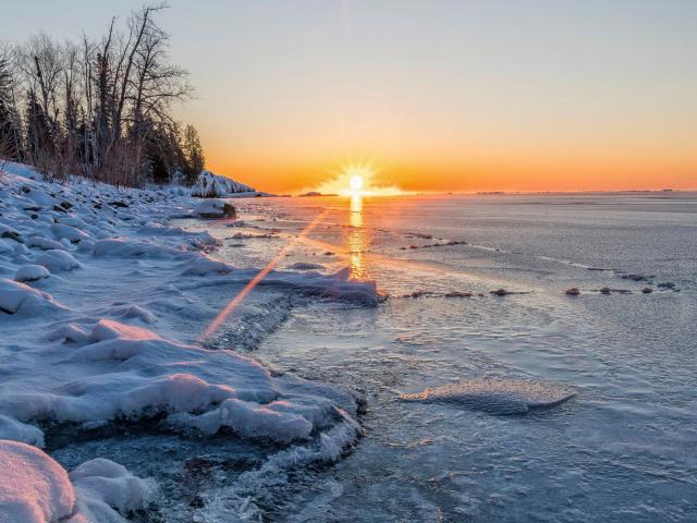 Wallpaper The bright sun illuminates the snow-covered river banks