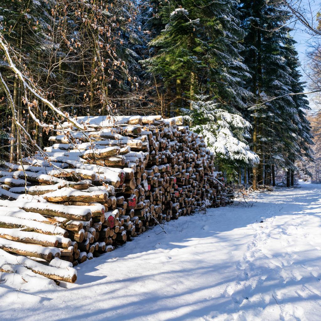 Wallpaper Harvested firewood in a snowy forest
