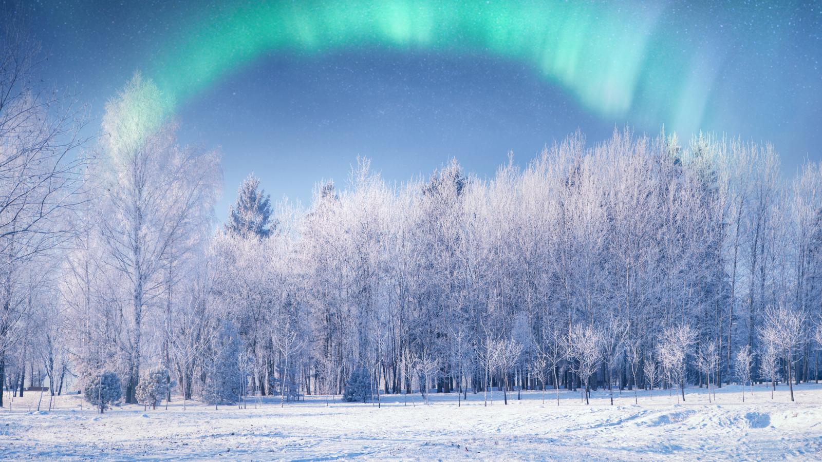 Wallpaper Northern lights on a forest covered with frost