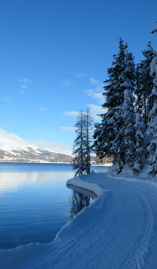 Wallpaper Snow covered road by the lake