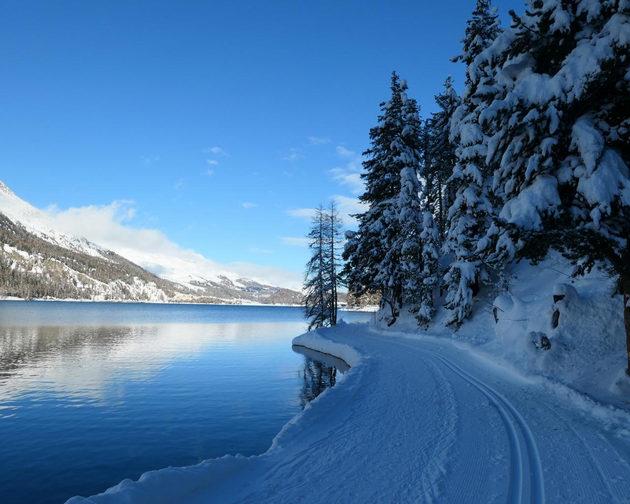 Wallpaper Snow covered road by the lake