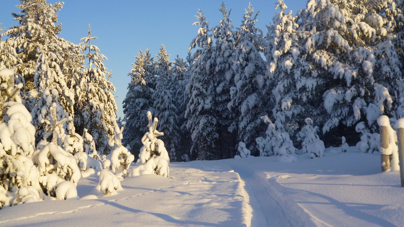 Wallpaper Trail in the forest with snow-covered fir trees