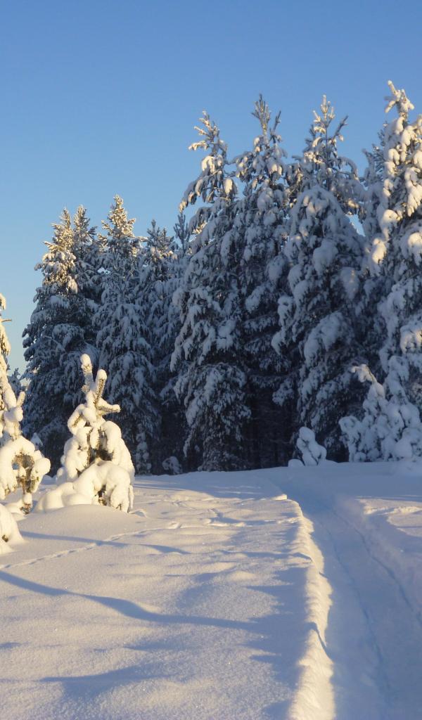 Wallpaper Trail in the forest with snow-covered fir trees