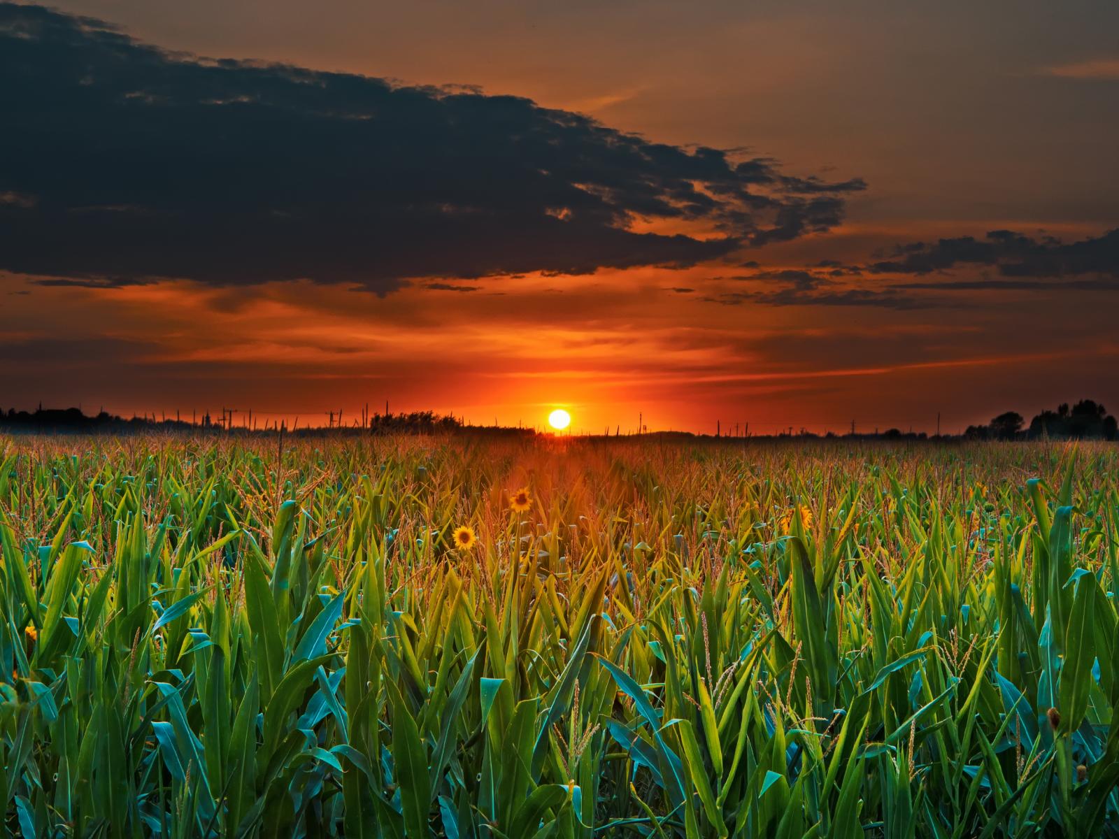 Wallpaper Sunset of the summer sun over a cornfield
