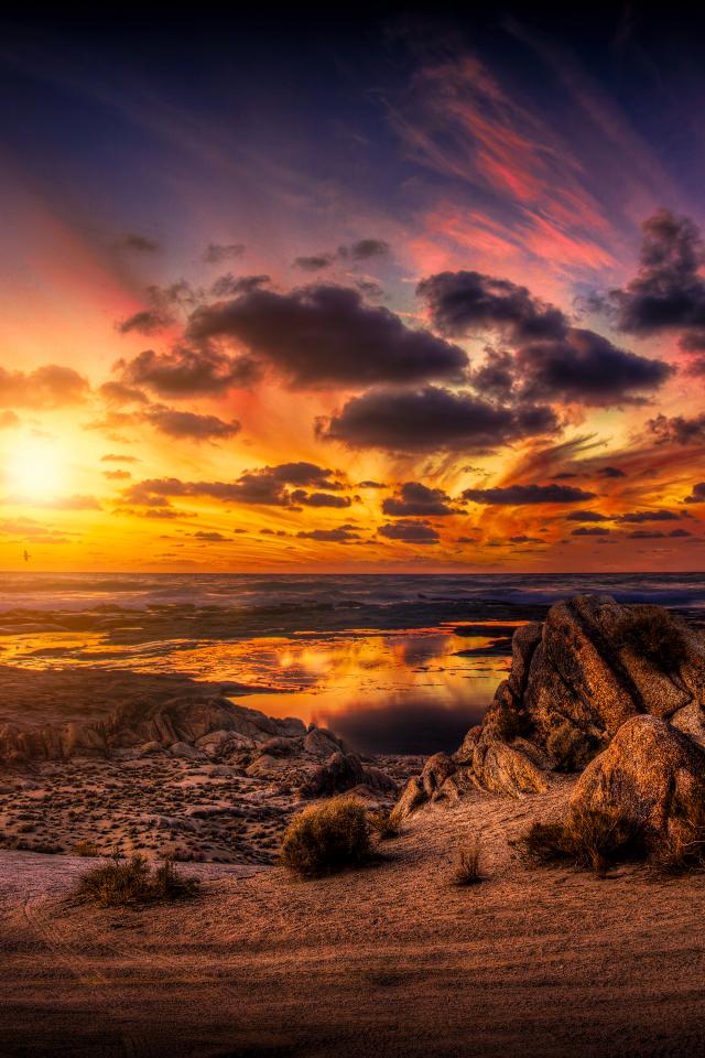 Wallpaper Sunset in the cloudy sky over the dried-up lake
