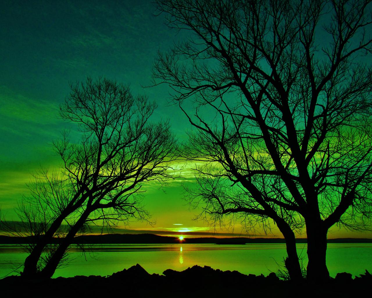 Wallpaper Silhouettes of trees are reflected in the water at sunset