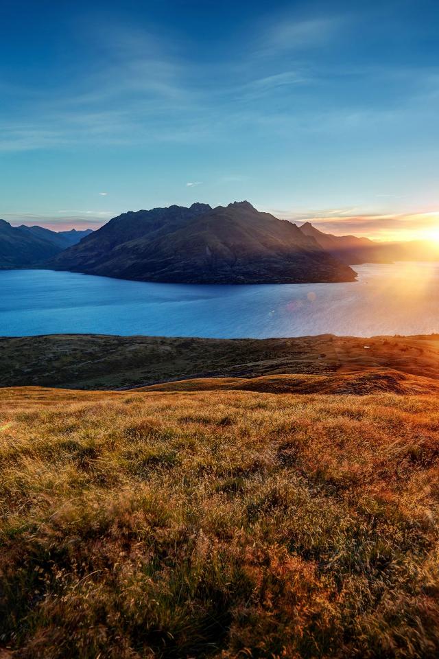 Wallpaper Dawn over the mountains in the blue sky