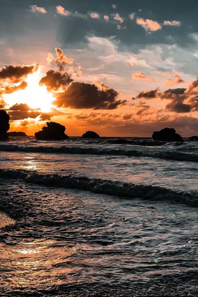 Wallpaper Rock in the sea at sunset under a cloudy sky