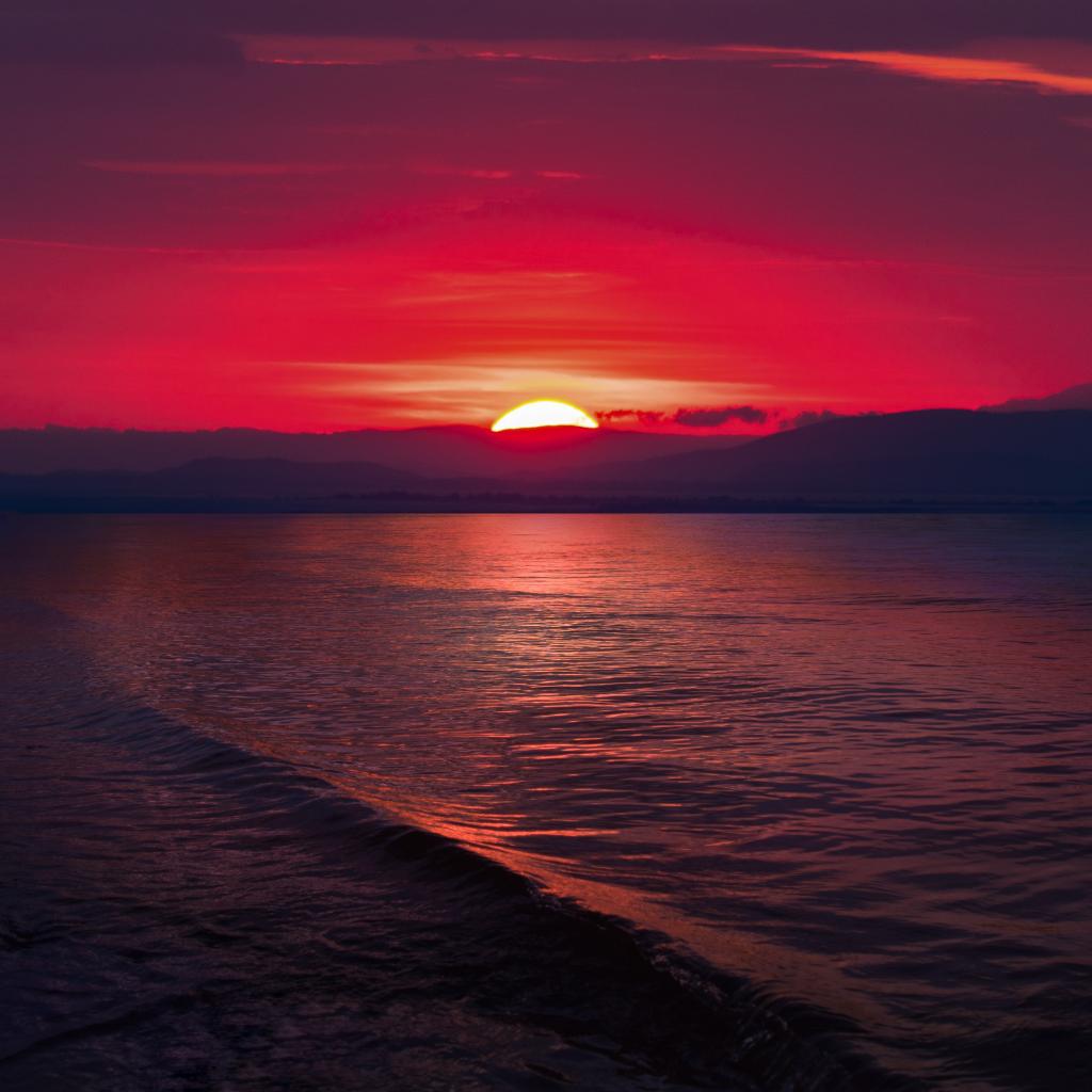 Wallpaper The sunset of the red sun on the sea horizon
