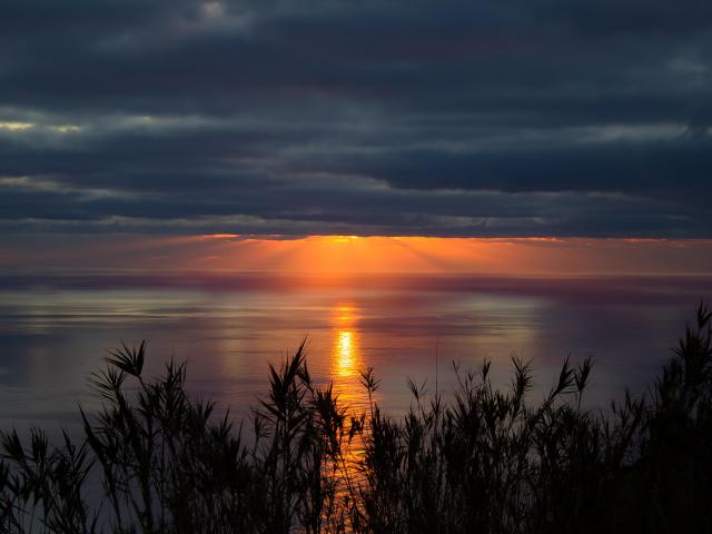 Wallpaper Sunset in the cloudy sky over the dried-up lake