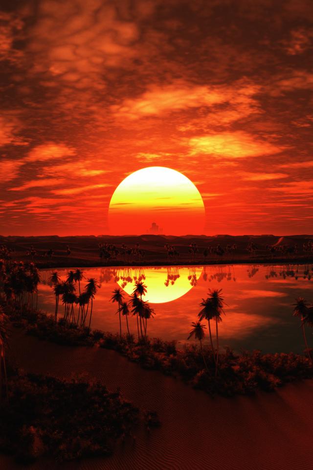Wallpaper Sunset of the big sun over the desert in the tropics