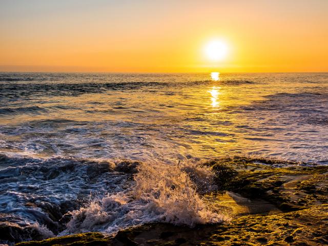 Wallpaper White waves beat against the shore at sunset