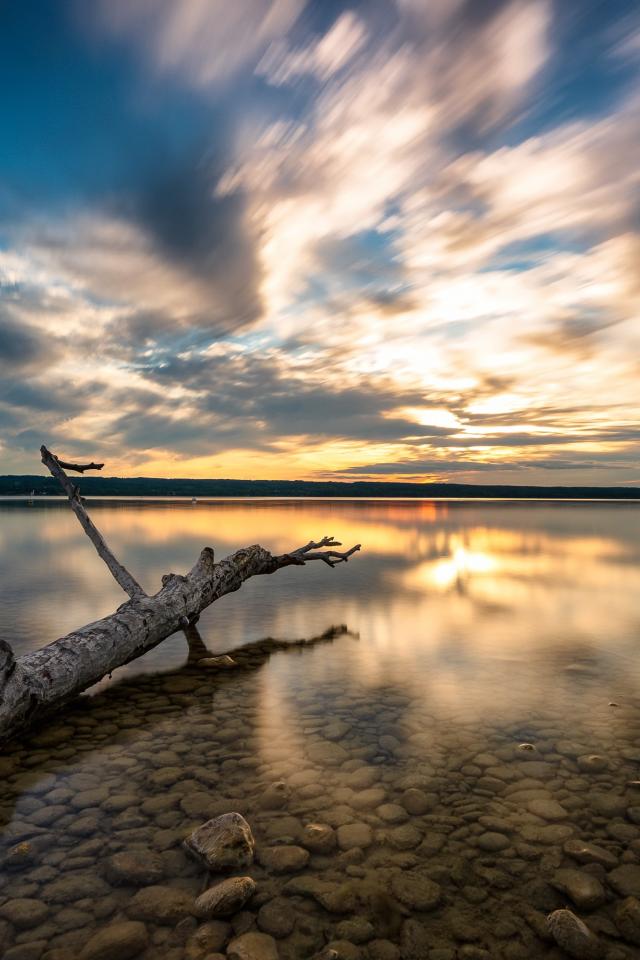Wallpaper An old tree lies in the water at sunset