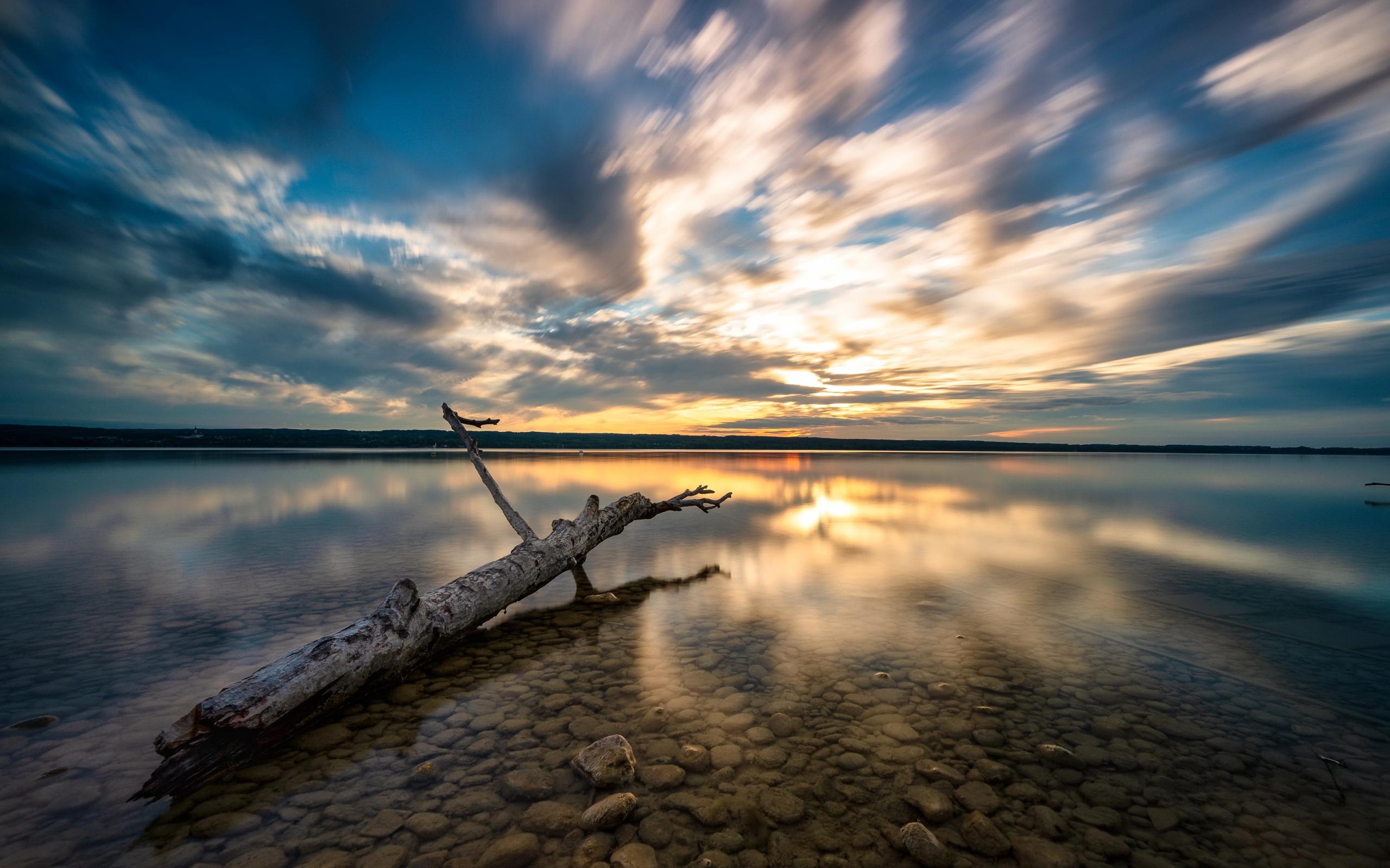 Wallpaper An old tree lies in the water at sunset
