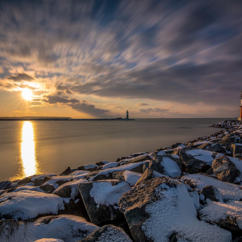 Wallpaper Snow-covered stones by the sea with a lighthouse at sunset
