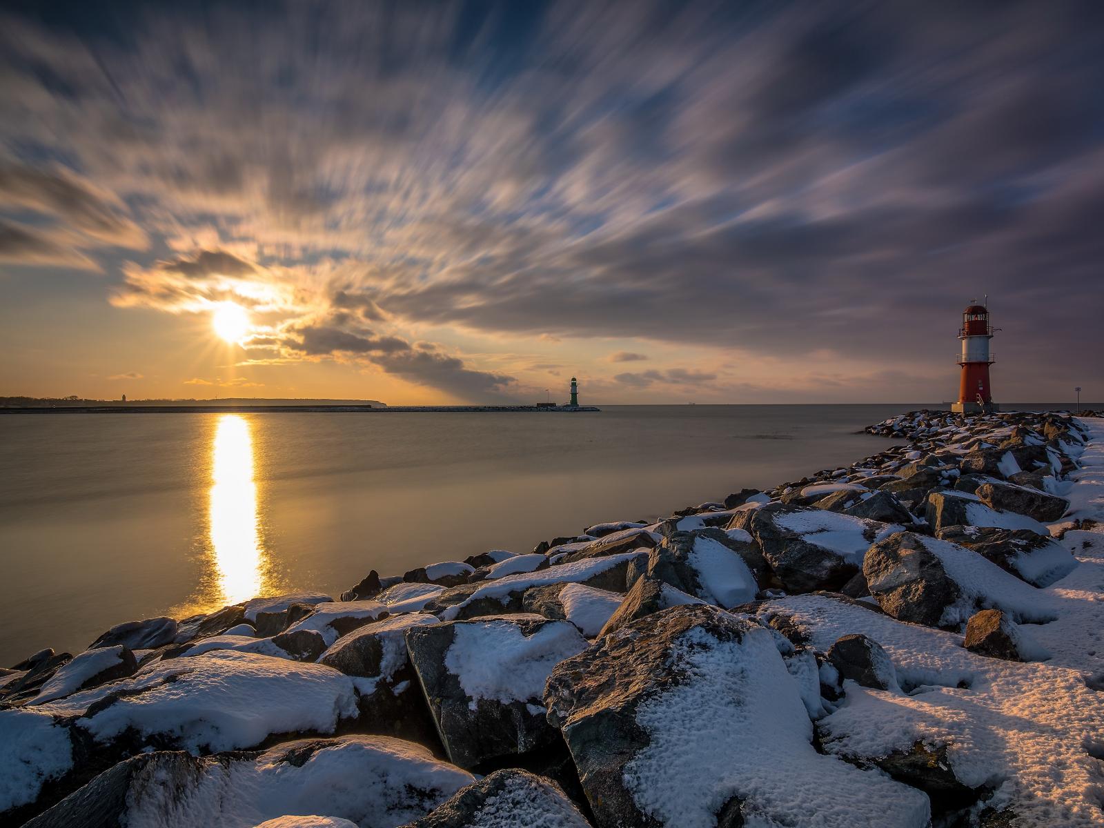Wallpaper Snow-covered stones by the sea with a lighthouse at sunset