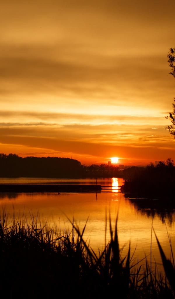 Wallpaper Sunset bright autumn sun over the river