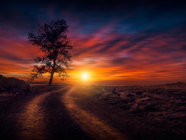 Wallpaper Tree by the road at sunset in the sky