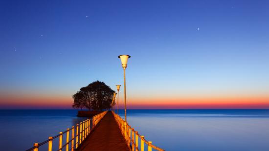 Wallpaper Bridge with lanterns in the sea at sunset