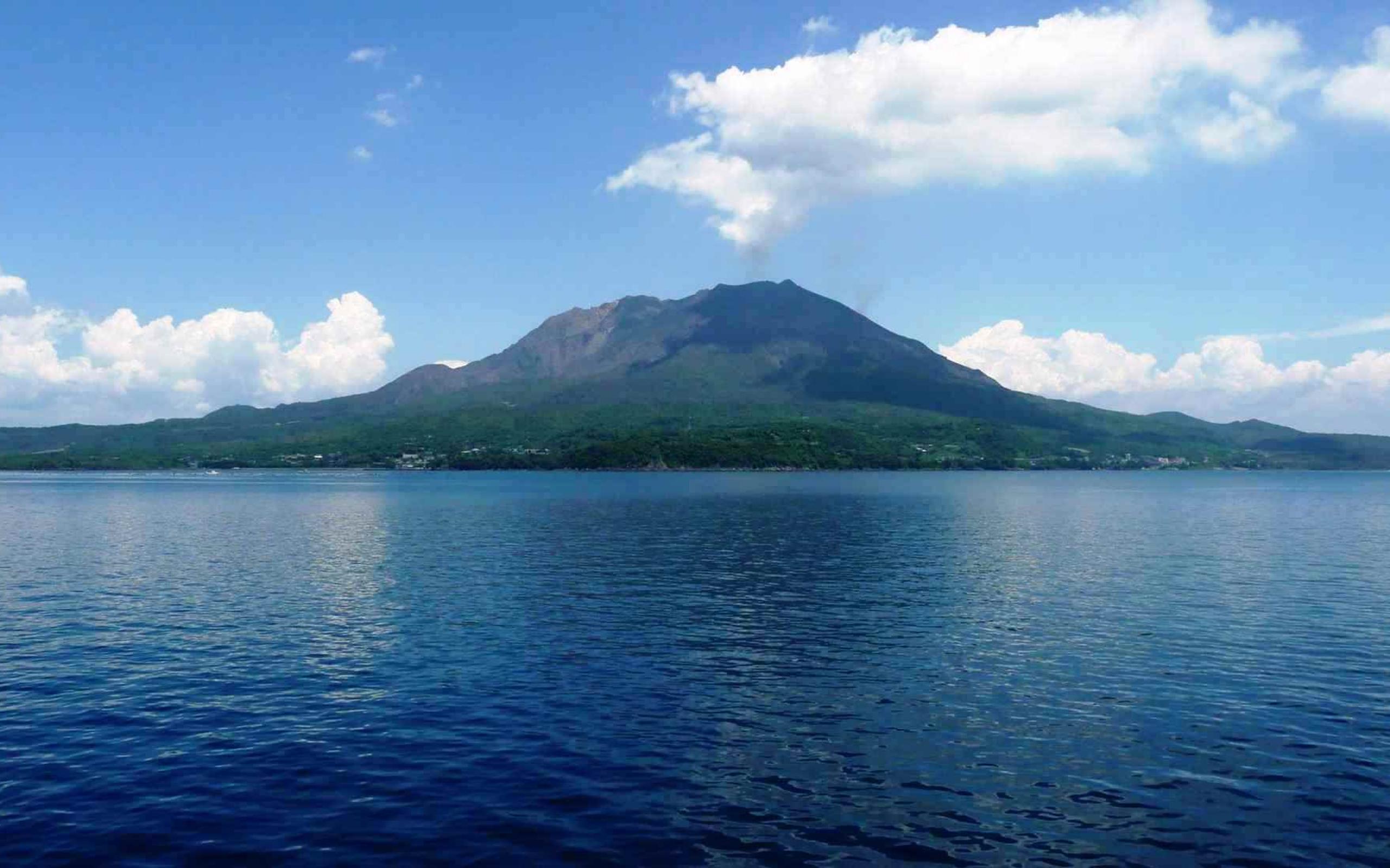 Wallpaper The volcano of Sakurajima erupts against the background of water