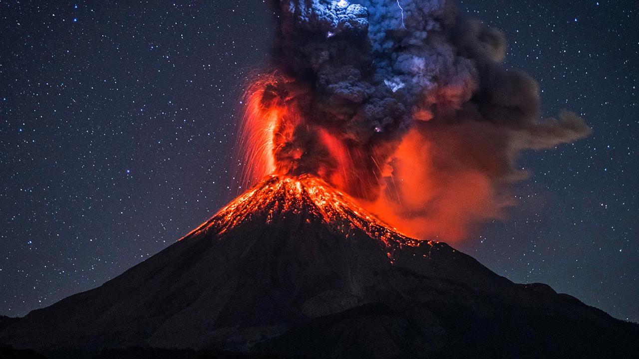 Wallpaper Lightning above the black smoke erupting volcano Colima