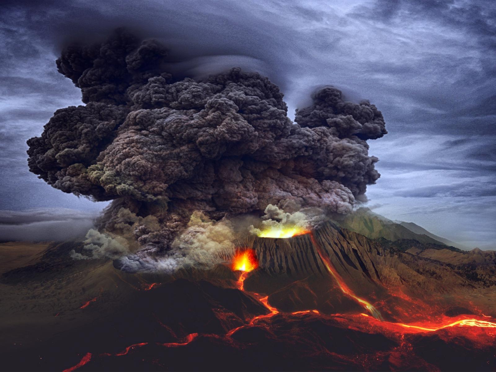 Wallpaper Thick cloud of black smoke above a spewing volcano