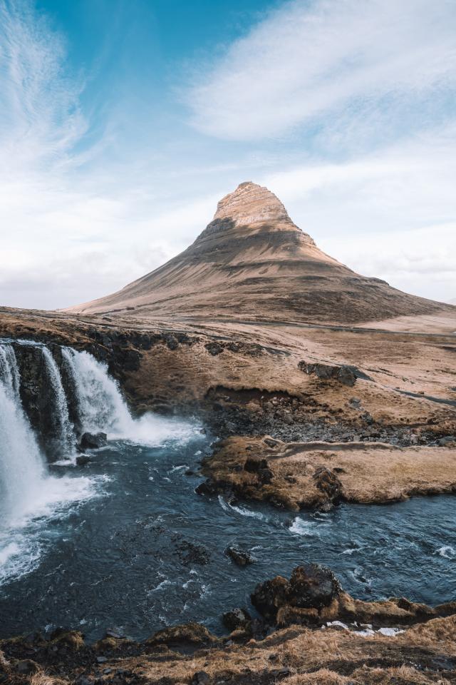 Wallpaper The waterfall flows into the river at a quiet volcano