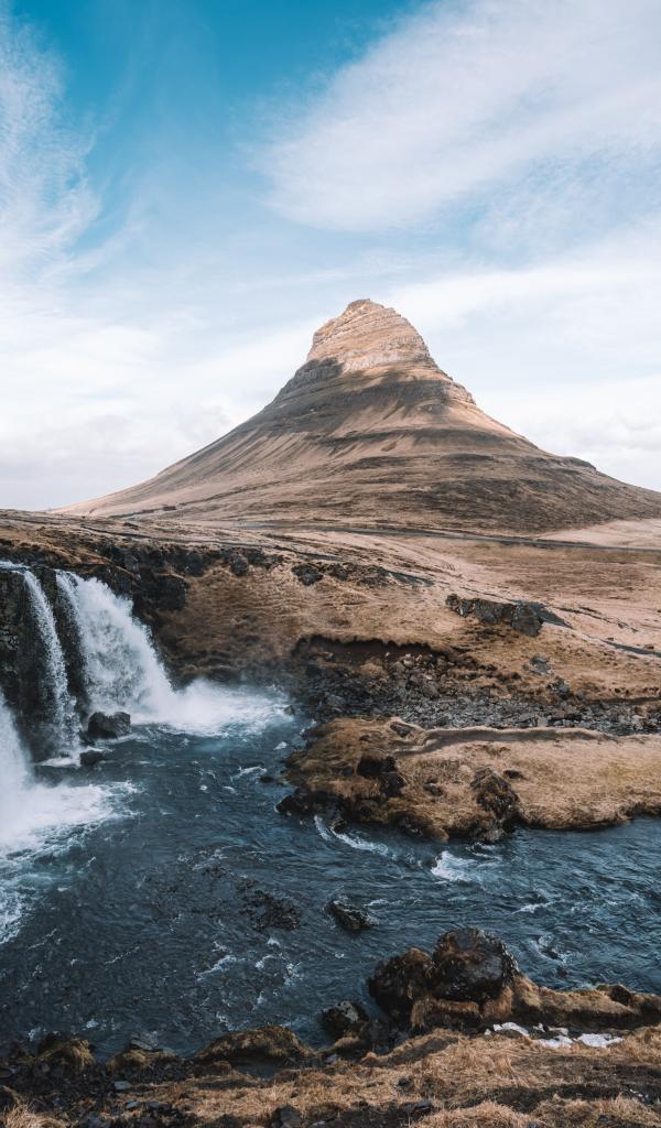 Wallpaper The waterfall flows into the river at a quiet volcano