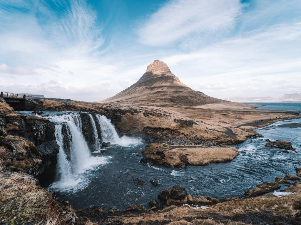 Wallpaper The waterfall flows into the river at a quiet volcano