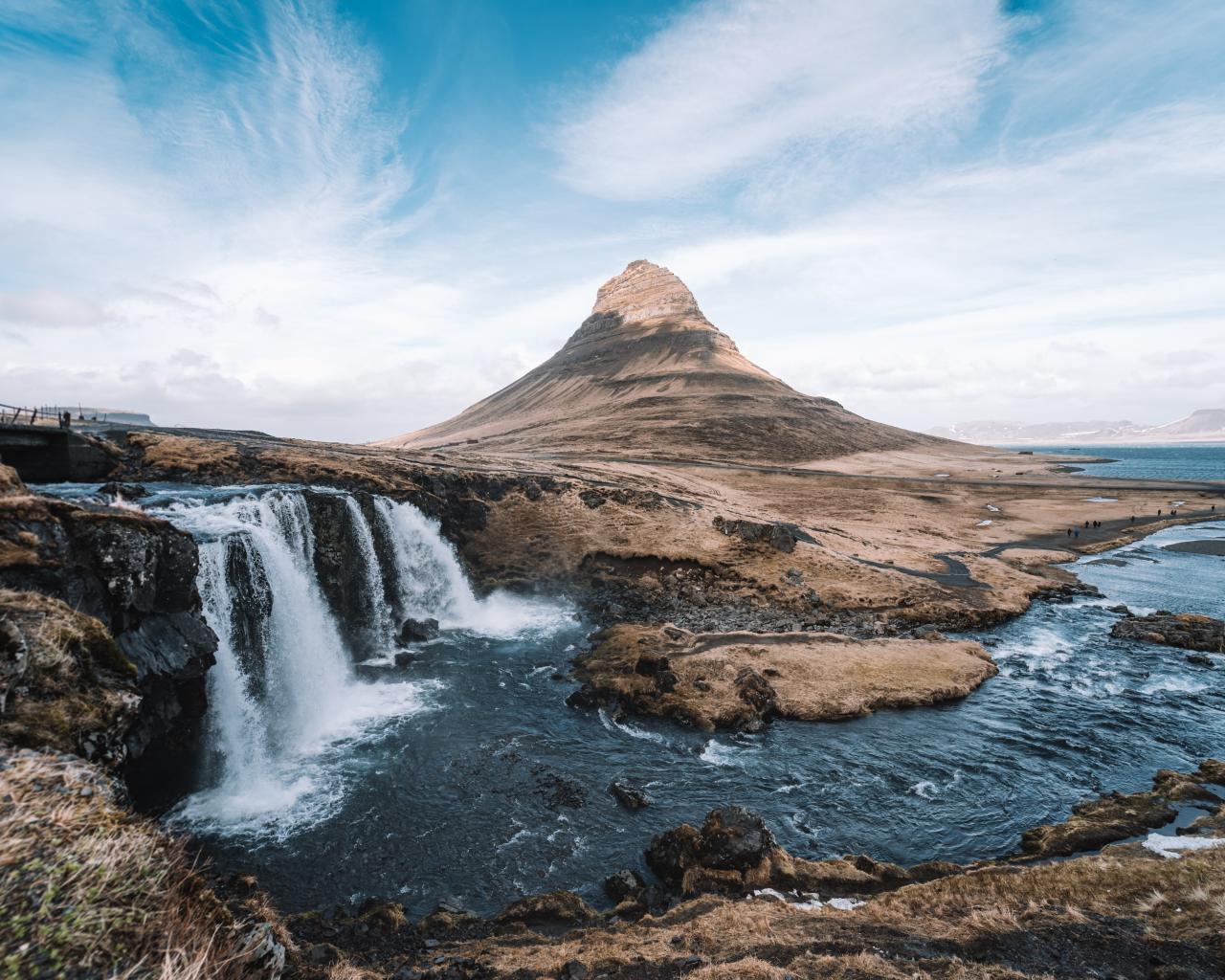 Wallpaper The waterfall flows into the river at a quiet volcano
