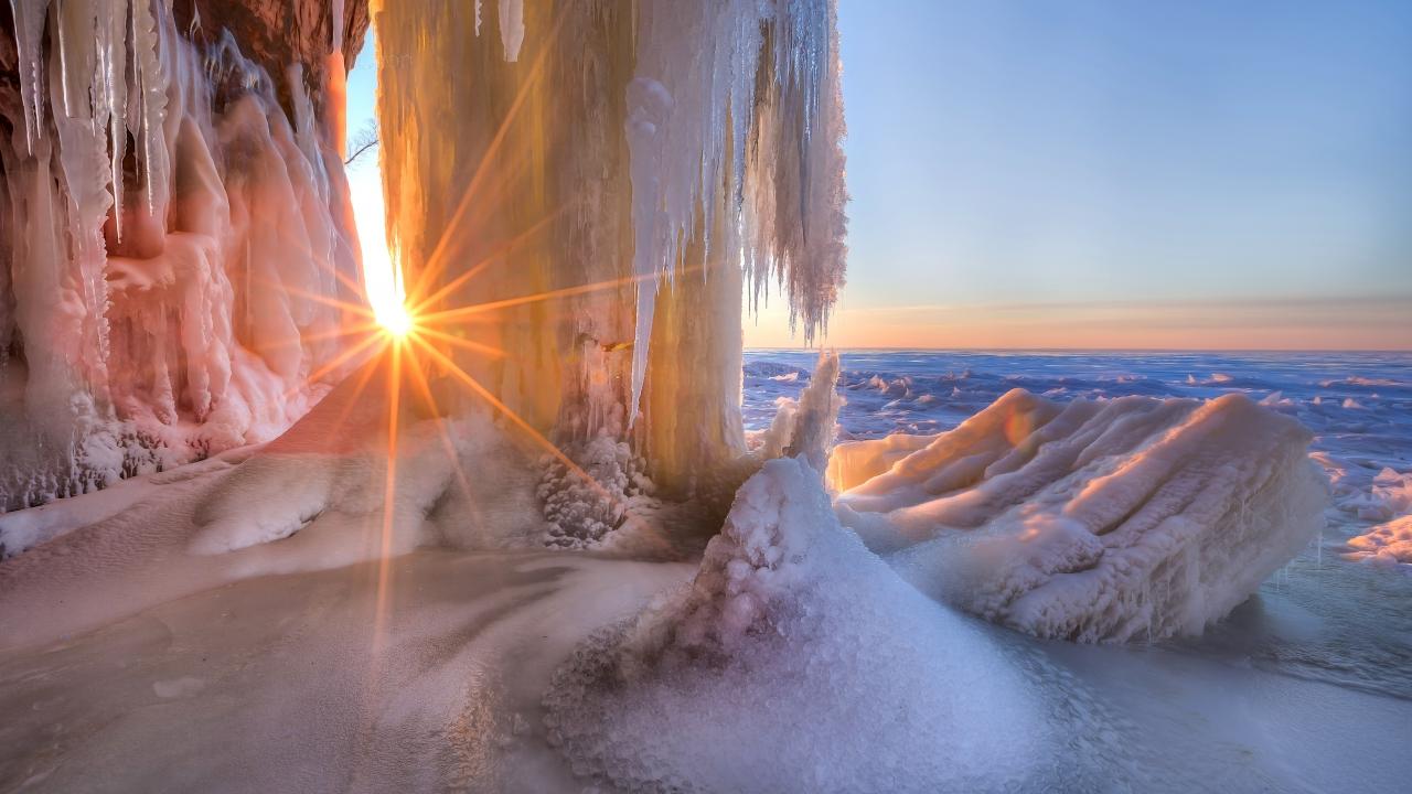 Wallpaper Frozen waterfall with rays of bright sun
