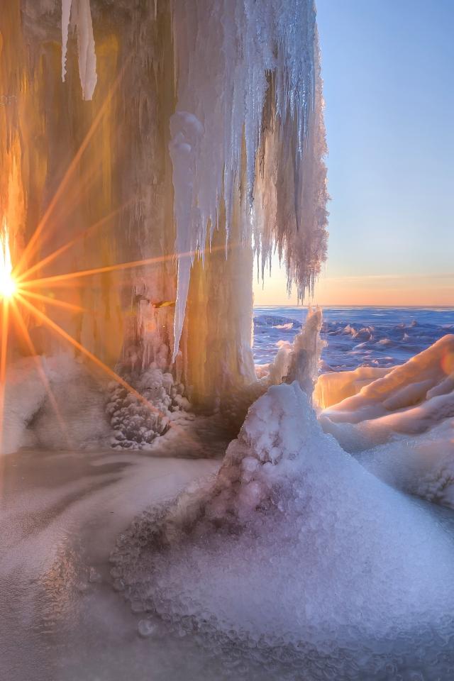Wallpaper Frozen waterfall with rays of bright sun