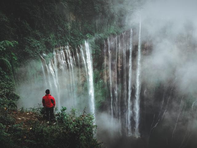 Wallpaper A man looks at the waterfall from above.