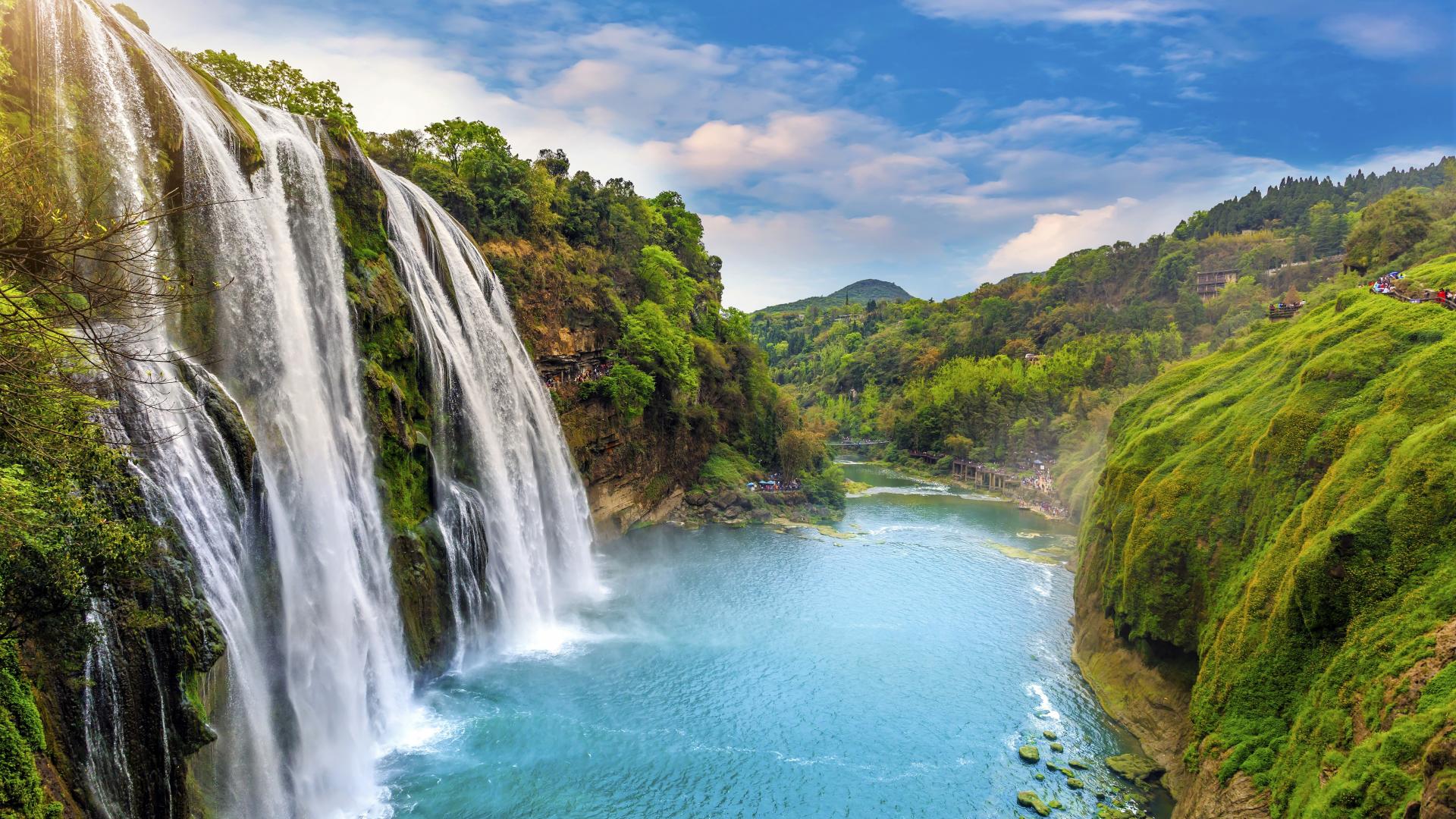 Wallpaper Beautiful waterfall drains from a cliff under a blue sky