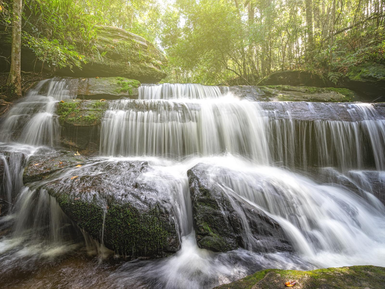Wallpaper A forest waterfall flows down the rocks