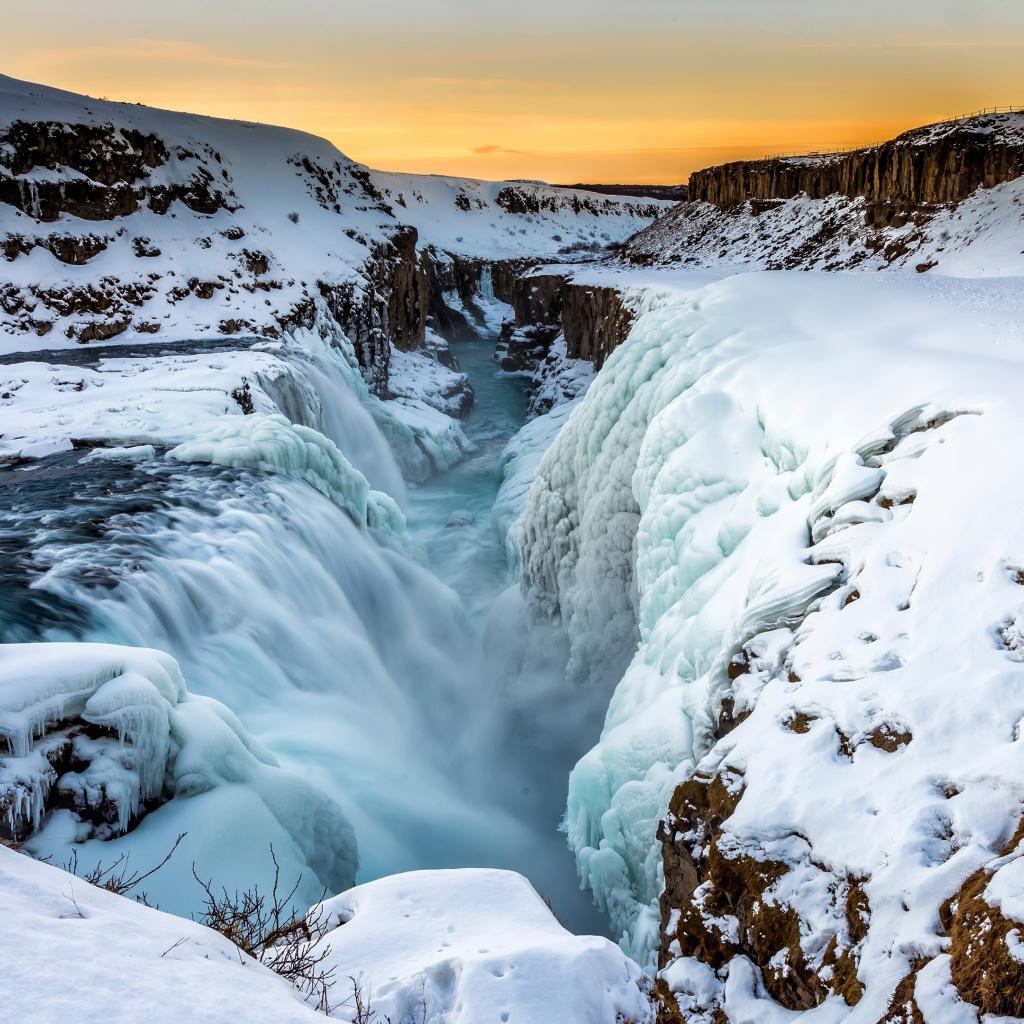 Wallpaper Frozen Waterfall on Snow Covered Shore, Iceland